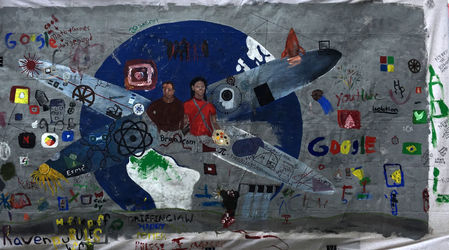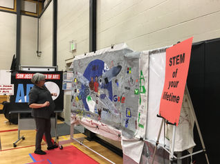 With help from Julia Jacobson, Tricia and Barb created the background of a mural inspired by Diego Rivera’s Man, Controller of the Universe and invited students and their families to contribute to the mural during the STEM Faire. A monitor in the booth displayed images from our Mexican Art and Activism presentation to complement the Rivera mural inspiration.