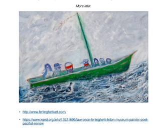 The second Study Group of 2022 was held virtually on December 12th. It centered on artists who work in or drew inspiration from multiple genres. Docents who attended the study group either by presenting or observing were gallery docents Michaela Landrok and Martha McKee-Hayden. LLAA docent Lisa Dearborn presented on "The Connection between Music and Painting." Nancy Dunne visited the Lawrence Ferlinghetti exhibit at the Triton and spoke about how his poetry inspired his art. Jody Foster gave a presentation on the connection between poetry/writing and painting. Elizabeth Bonnet spoke about her visit to the Musee de l'Orangerie in Paris and the work of Joni Mitchell who was inspiried by the music of Betsy Jolas. Tony Misch showed us the work of the film artist Agnes Varda and Liana and Lotte presented their interview with Dennis Marien who helped illustrate the graphic novel: Gilfamesh. Susan Curtin, Marcia Klein and Sherry Tsai and Mary Perry were on hand to contribute to the discussion