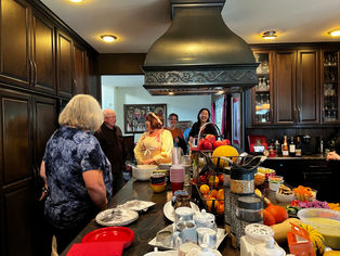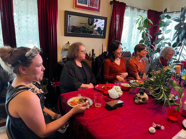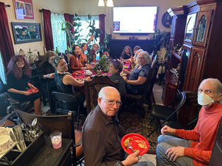 On October 24th the Continuing Education Committee invited us to gather at Suman Ganapathy's home in Morgan Hill to present the spooky theme of Art and Horror and how artists have depicted the horrific in the visual arts. The pot-luck featured Ghostly cookies, Spider bell peppers and colorful vegetables and food that embraced Halloween. A few docents came in costume; Lisa Lewis as a fair maiden from the Renaissance, Jennifer McGougan in Steam Punk and Toby Fernald as a very cute witch! There were five presentations: Suman Ganapathy - "Unveiling the Darkness - The Meaning of Horror in Art." Christina Zhao - "Skeletan Fantasy Show." Debbie Watson - "The Exorcist." Jody Foster - "The Changing Face of Horror in Art." Lisa Dearborn - "Landscapes of Desolation." Joseph Coha - "Goya."