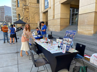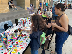 Dancing in the circle near the circle of palms and doing art. Suman set up the art activity for the August City Dance in front of the museum. Is that a new Jackson Pollock or Keith Haring masterpiece? Lotte, Suman Janine and Christina made sure everyone enjoyed this creative art piece.